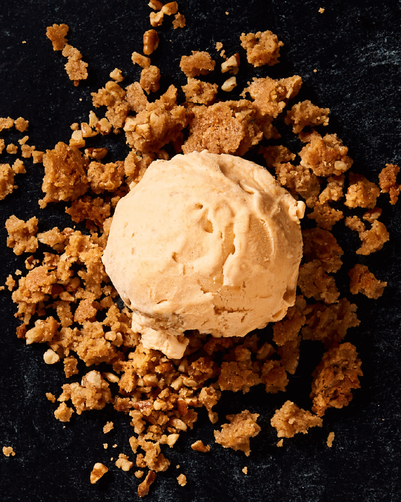 Sweet potato ice cream with mini marshmallows and crunchy pecan streusel